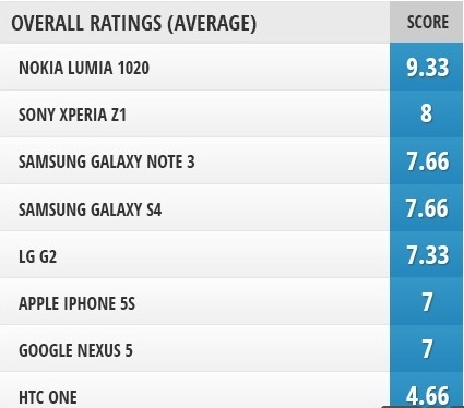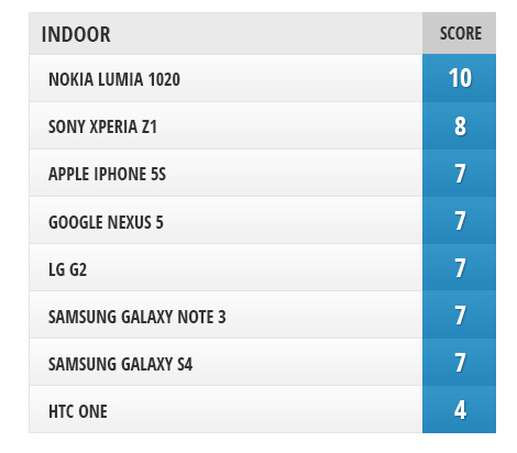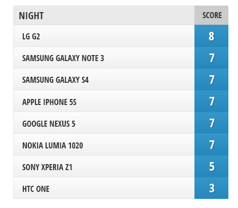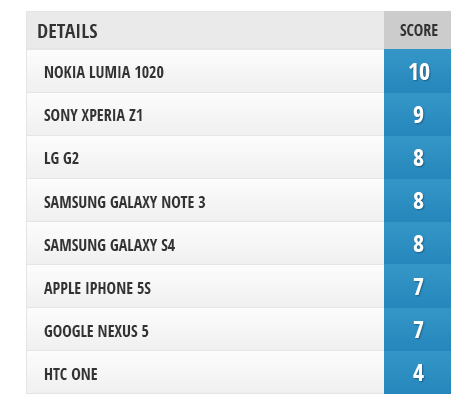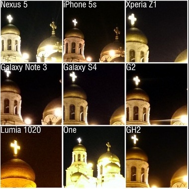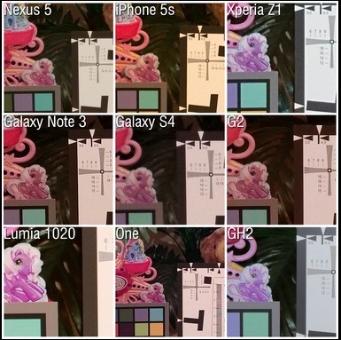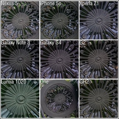 Những smartphone được trang PhoneArena sử dụng để so sánh bao gồm: Nexus 5 của Google, iPhone 5S của Apple, Xperia Z1 của Sony, Galaxy Note 3 và S4 của Samsung, LG G2 của LG, Lumia 1020 của Nokia và cuối cùng là HTC One của HTC. Dưới đây là những so sánh cụ thể: Độ chi tiết