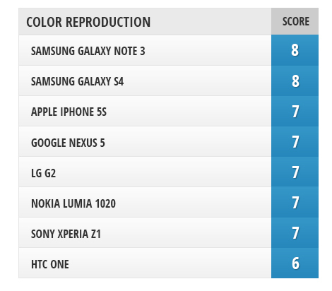 Chiến thắng trong hạng mục này chính là những chiếc điện thoại đến từ Samsung với Galaxy S4 và Note 3. Việc tái hiện màu sắc của hai thiết bị này không quá tẻ nhạt cũng không quá nhãi nhép. Ngoài ra nó còn nắm bắt màu sắc khá tốt trong môi trường ánh sáng phức tạp. Trong phòng